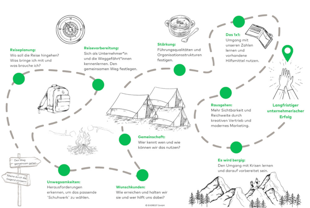 EVEREST will eine bessere Wirtschaft ermöglichen und dafür mehr Menschen dazu empowern, ihre Ideen unternehmerisch umzusetzen. Aus guten Ideen Geschäftsmodelle und Businesspläne zu machen – dafür haben wir Tools geschaffen. Aber wie können wir helfen, dass auch das Handwerkszeug der Unternehmensführung erlernt wird und es zu einer erfolgreichen und freudigen Erfahrung wird? Da halten wir das deutsche System der Einzelförderung mit Hilfe von Beratungszuschüssen für nicht optimal. Unternehmer*innen wollen voneinander lernen – echte Erfahrungen helfen da am meisten. Die Frage, wie wir das methodisch ermöglichen können, beschäftigt uns schon lange.
