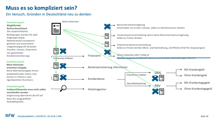 In Deutschland ist die Zahl der Gründungen rückläufig, sowohl statistisch als auch strukturell. Die Hürden sind hoch, das System komplex, das Risiko für viele zu groß. Bei der Betrachtung von Einzelgründungen zeigt sich: Es gibt einen hohen Rechercheaufwand, Einkommen und Umsätze müssen geschätzt werden und je nach Institution gibt es verschiedene Definitionen von Nebenerwerb. All das erschwert den Prozess.