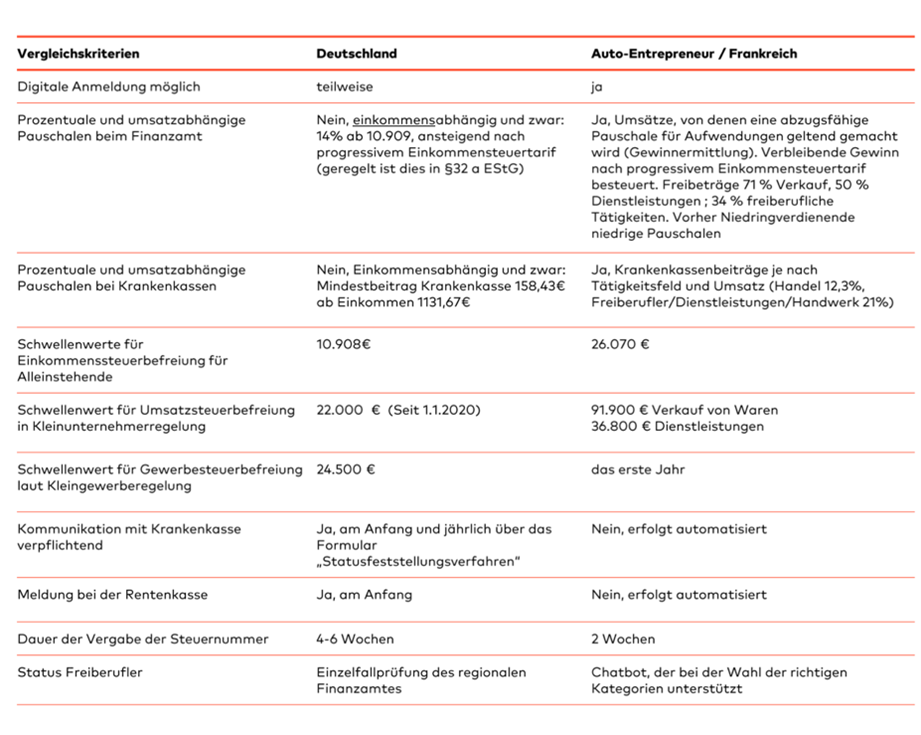 Steuern und Sozialabgaben richten sich direkt nach dem Umsatz und werden anhand von Pauschalen berechnet. Dadurch sind die Abgaben von Anfang an transparent und planbar. In Deutschland hingegen existieren fragmentierte Zuständigkeiten, unterschiedliche Definitionen sowie Abgaben, die auf Gewinn-und Umsatz-Schätzungen basieren. Diese Schätzung ist im Voraus kaum möglich. Die Komplexität des deutschen Systems erschwert Planung und überfordert Gründungswillige.